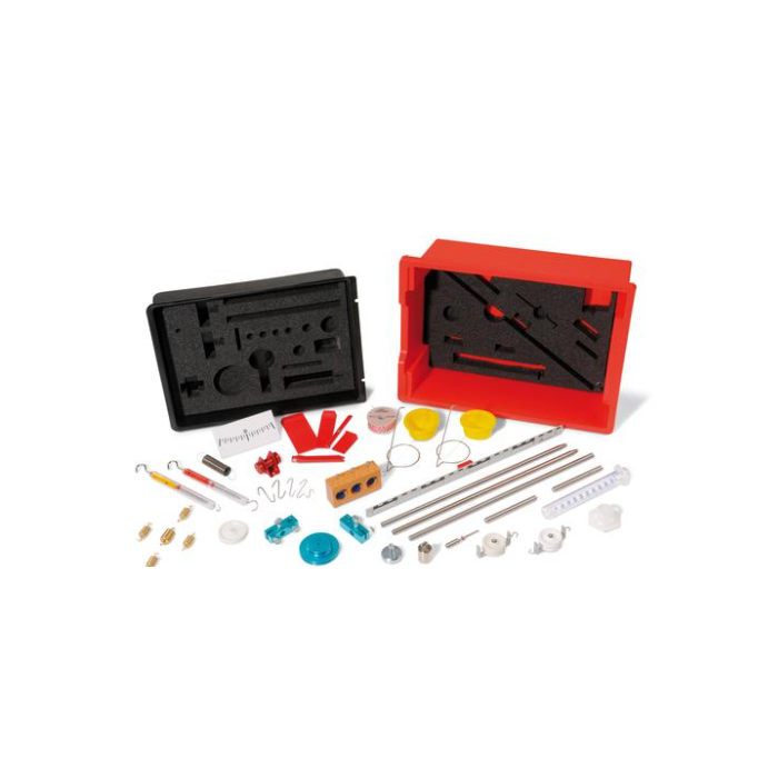 Set of equipment for carrying out 23 student experiments in classical mechanics. In a tough plastic tray containing a foam insert with cut-outs for the equipment and featuring a transparent lid. Experiments are set up and performed on the SEK Base Plate 1000789 (U8408035) so that they are compact but still clear in their layout and objectives.