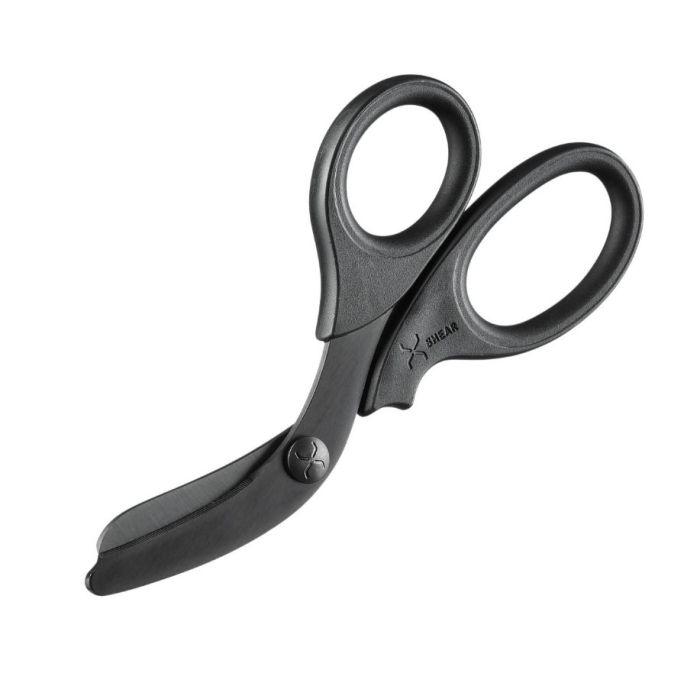 The XSHEAR® is a heavy duty trauma shear designed to outperform traditional trauma shears in every way. The hardened 3mm thick stainless steel blades have a comfortable grip with slip resistant inner handles. The patented curved design for gentle approach when cutting near skin is hinged by a heavy duty center bolt that will not loosen over time. The razor sharp blades have a serrated lower blade to help cut through tough material with ease.