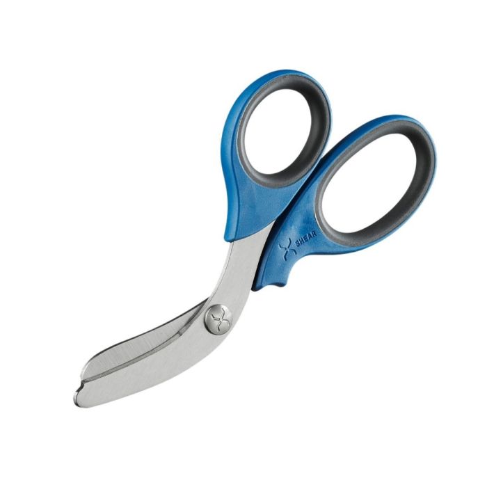 The XSHEAR® is a heavy duty trauma shear designed to outperform traditional trauma shears in every way. The hardened 3mm thick stainless steel blades have a comfortable grip with slip resistant inner handles. The patented curved design for gentle approach when cutting near skin is hinged by a heavy duty center bolt that will not loosen over time. The razor sharp blades have a serrated lower blade to help cut through tough material with ease