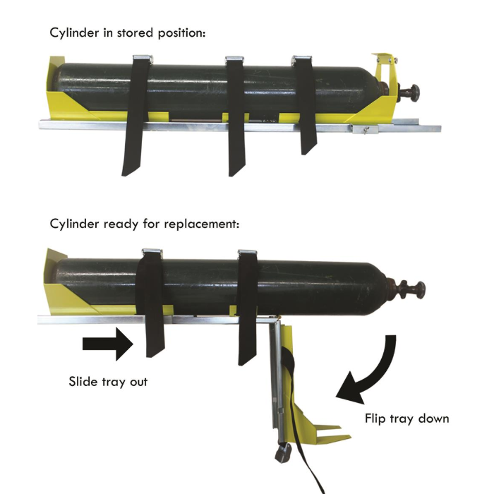 To switch cylinders, flip the latch and slide the tray out of the compartment. Once extended, release the hinge to drop the top half of the bracket 90 degrees and out of the way. Slide in the new gas cylinder as if you were loading a torpedo. Once cylinder is secured in place, lock the hinged bracket back into the stored position and slide tray back into the compartment.
