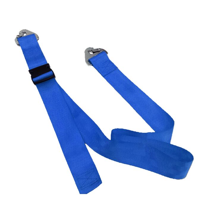 Blue Nylon, 5 Foot strap with plastic side release and non-swivel speed clip ends. The strap is made of 2 inch nylon; 2 piece. Webbing has 4000 lb. tensile strength. Made in the USA.