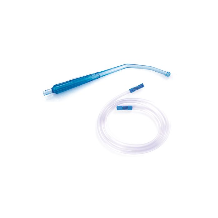 These Yankuer Suction Sets are made of blue-tinted, transparent, shatterproof plastic. They can be ordered with or without vent. The tubing is memory-free and made of opaque plastic, which permits monitoring of fluid, The ribbed outer wall provides slip resistance.