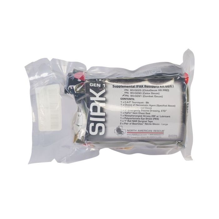 The Supplemental IFAK Resupply Kit (SIRK™), by North American Rescue® is a compact, durable and easy-to-open vacuum sealed kit that contains the essential items to treat the 3 leading causes of preventable combat death – extremity hemorrhage, airway obstruction and tension pneumothorax. Designed to fit into a BDU pocket or IFAK pouch, the SIRK™ is packaged in a clear bag to allow easy visualization of the kit contents while protecting the items from the elements. If preferred, the contents can also be removed from the vacuum sealed packaging to re-stock an existing IFAK.