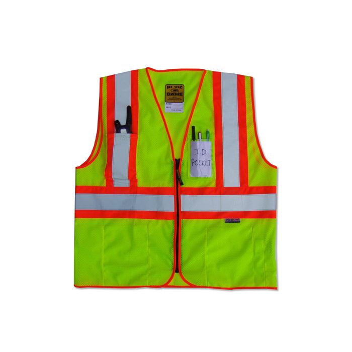 The D.O.T. Mesh Vest with Pockets in Fluor Yellow With Silver/Grey Refl Tape Bordered by 1" Fluor Orange Stripes