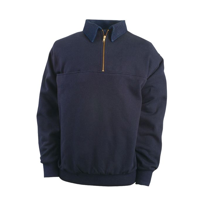 Anti-curling denim collar with hang loop, and denim elbow patches