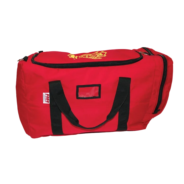 THE R&B GEAR BAG. #199-U. Constructed using Cordura® nylon that is extremely durable and abrasion resistant, yet remains soft to the touch even in sub-zero weather conditions, this Cordura® fabric has a urethane coating that helps repel liquids and dirt. This bag features a large “U” shaped #10YKK heavy duty zipper, handles that are constructed of heavy weight 2” nylon webbing and attached on top and on both ends of the bag, and an end pocket designed to hold your SCBA or personal items. It is available in red and weighs 30.4 oz. The overall area is 6,000 cubic inches and the overall dimensions are 26”L x 13”W x 18”H.