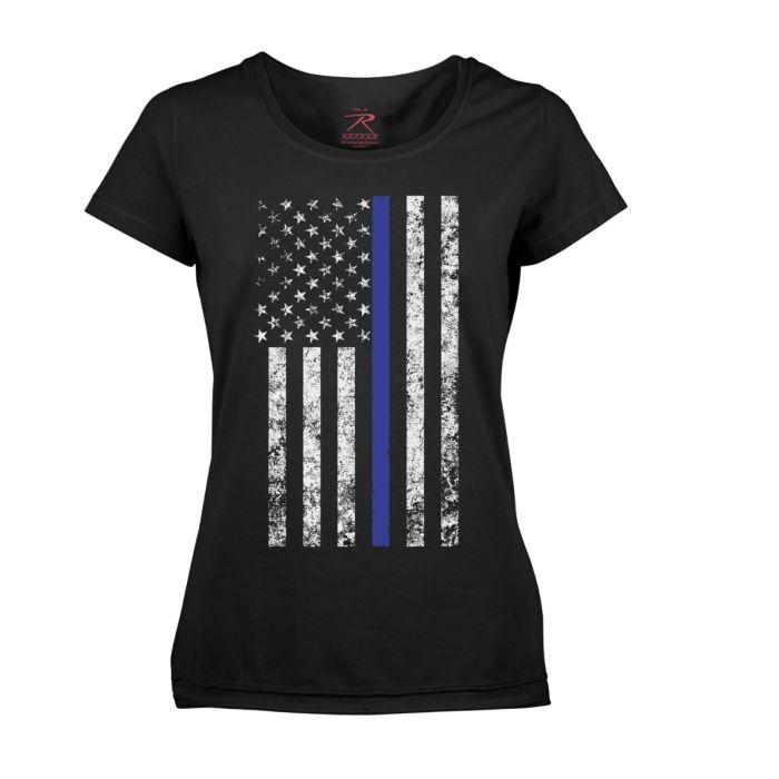 - Women's Shirt Features A Distressed Vertical Thin Blue Line Flag Print